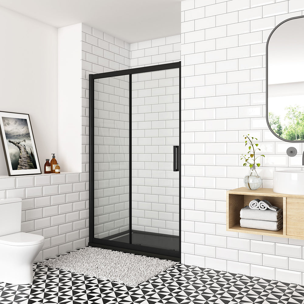 OCEAN porte de douche coulissante 100-160x195cm profilé noir mat en verre anticalcaire avec le système soft-close