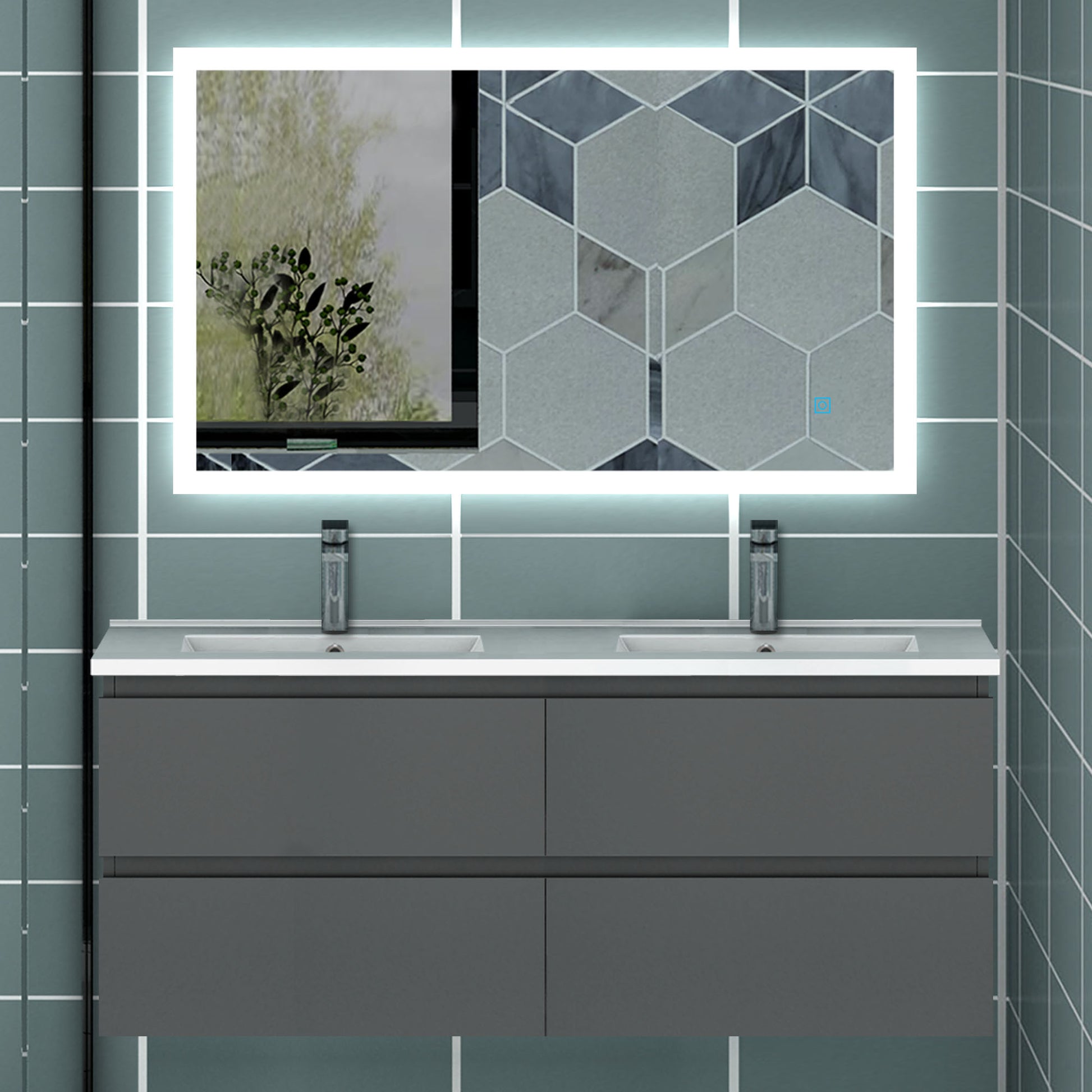 Meuble couleur blanc mat/ anthracite/ bois clair de salle de bain suspend avec 4 titoirs et double vasques (en céramique)