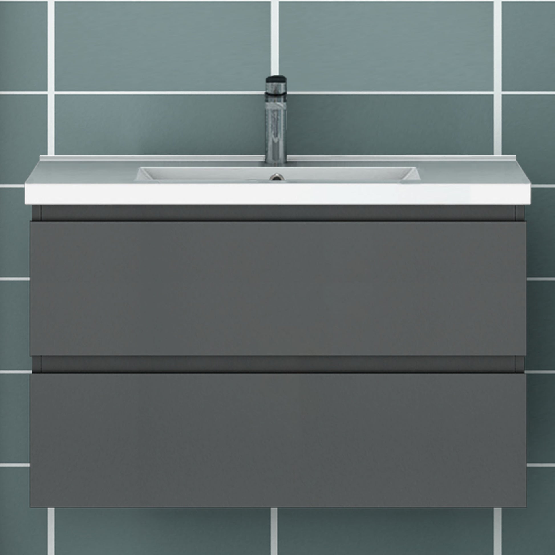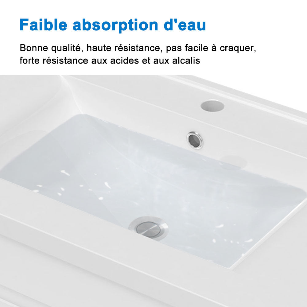 Meuble de salle de bain, Meuble blanc mat/ anthracite/bois clair avec 2 tiroirs & plan vasque en céramique