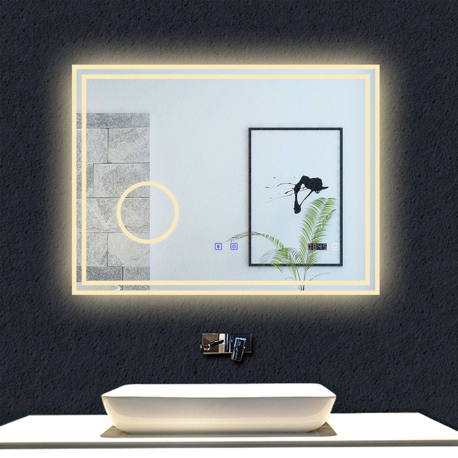 Miroir rectangulaire tactile Bluetooth simple tricolore avec antibuée, Horloge et miroir grossissant 3X.