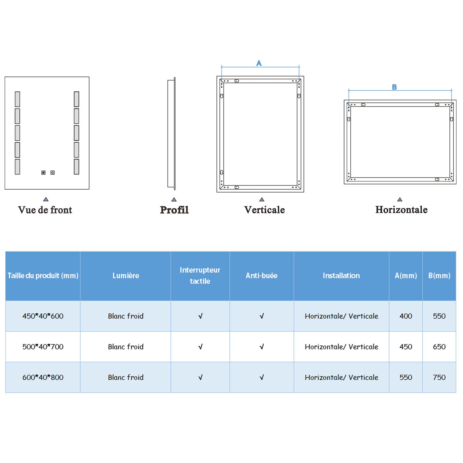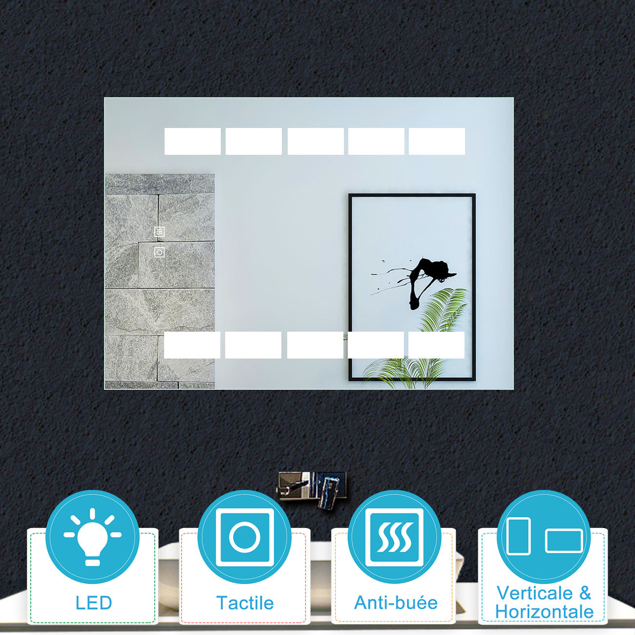 Miroir de salle de bain à 2 touches tactiles, avec fonction LED et anti-buée, Modèle Rail