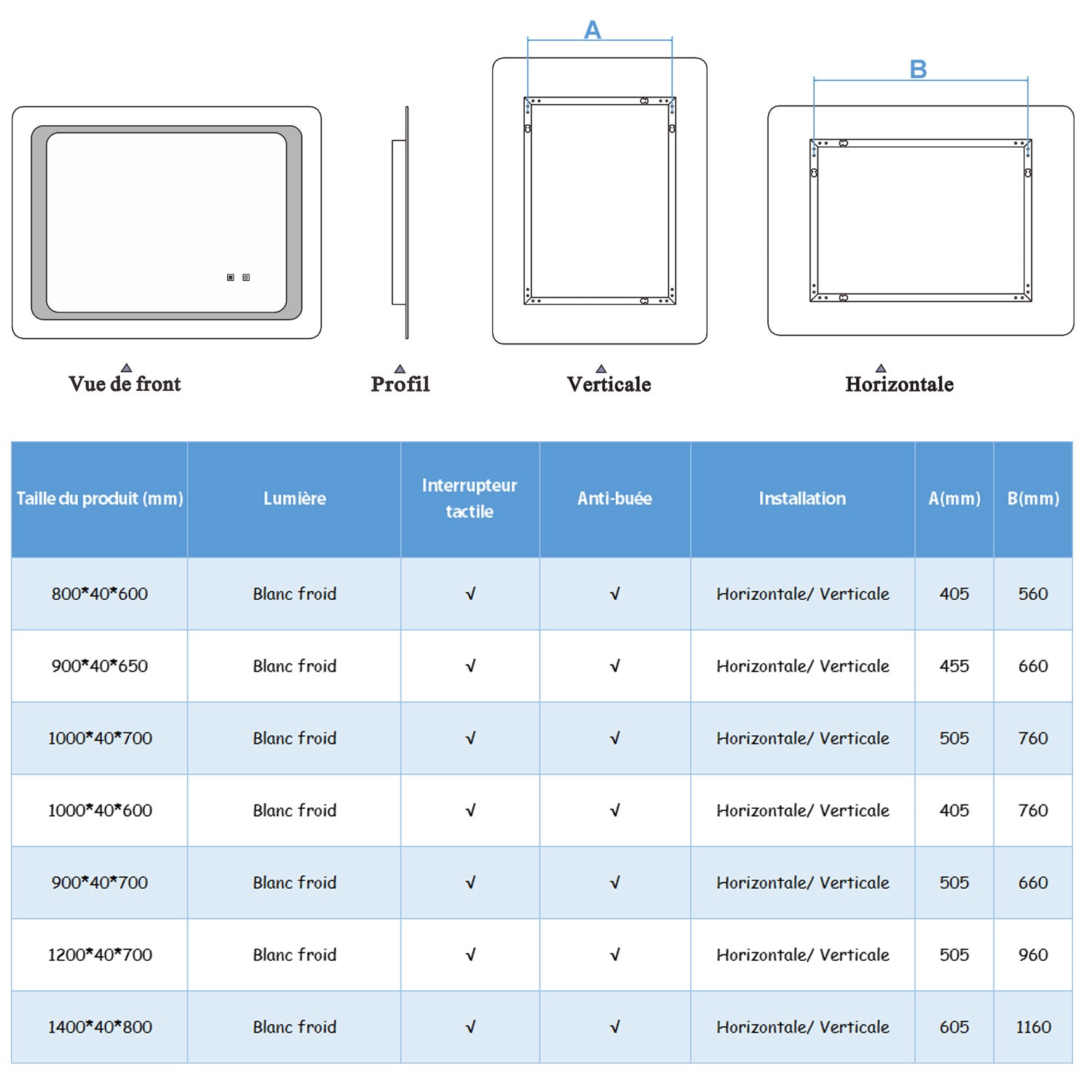 - Montage réversible: interrupteurs placés de manière à ce que le miroir puisse être monté verticalement et horizontalement, avec pre perçages, à installer dans le volume 2 et les zones hors volume de votre salle de bains.