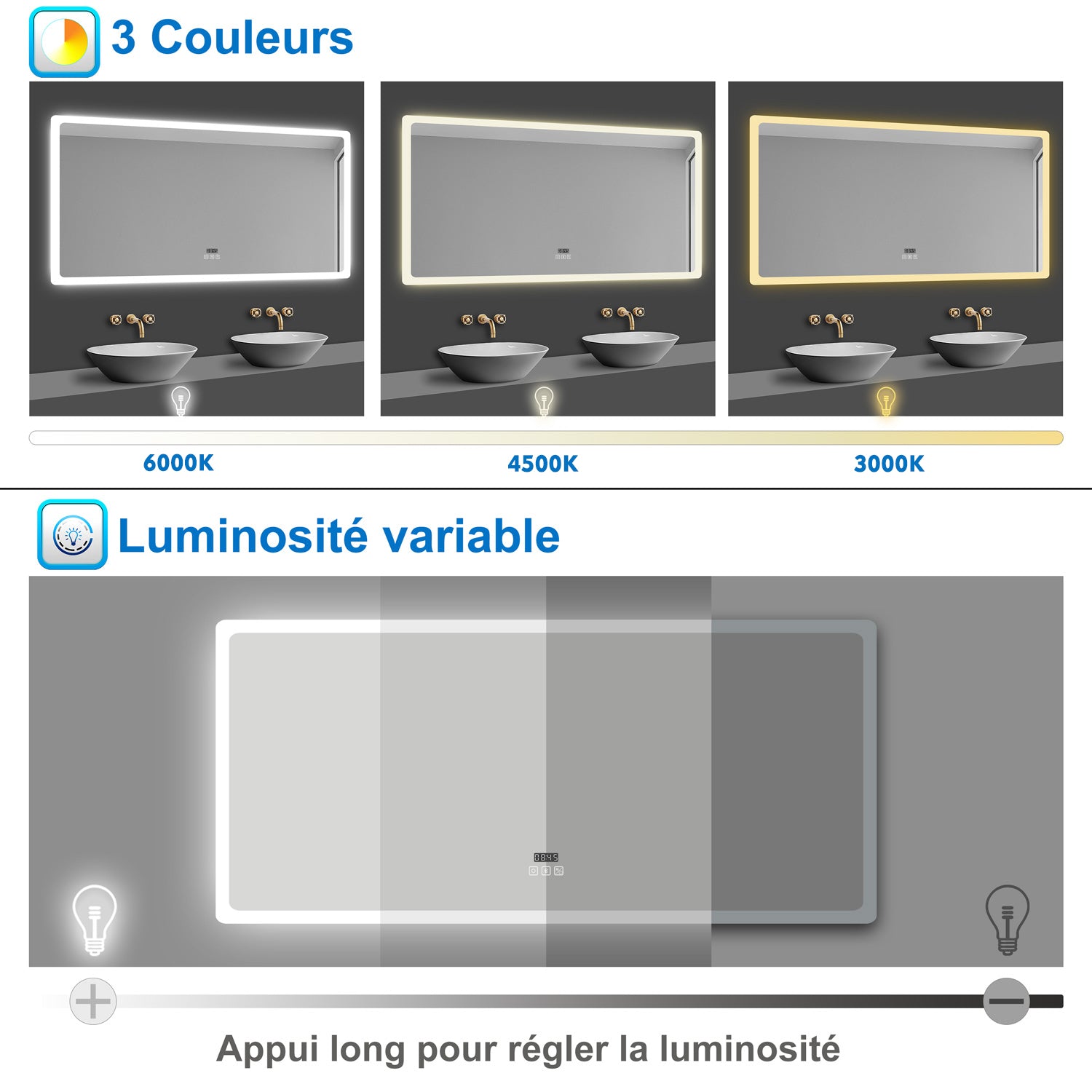 Interrupteur tactile- Trois boutons permettent de mieux régler la fonction et l'anti-buée du miroir ainsi que le bluetooth, nos miroirs sont conformes CE // IP44.