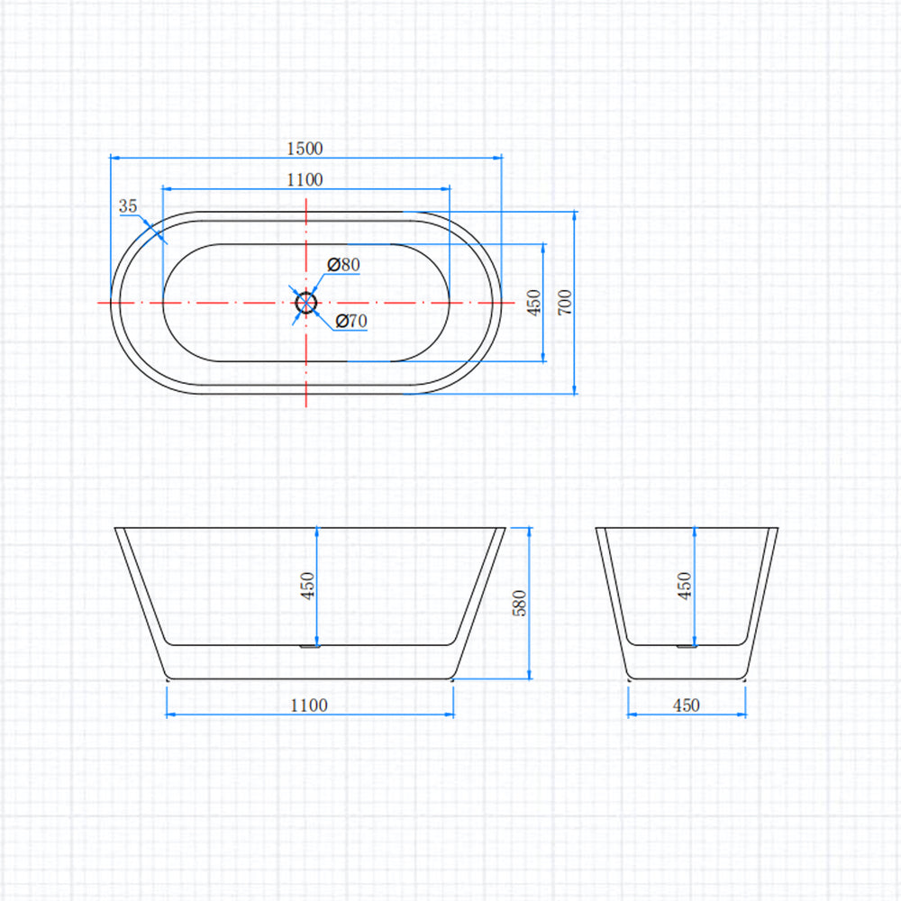 Ocean Baignoire îlot ovale luxueuse 150x70cm : Blanc brillant, acrylique easyclean et système anti-débordement