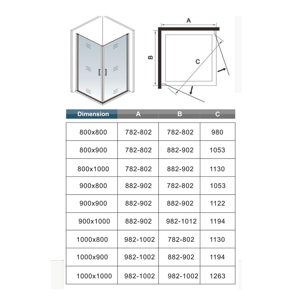 • Type: Cabine de douche carrée, installation en angle, montage réversible gauche ou droite,Dimension:80/90/100 x 80/90/100 x 200cm veuillez trouver les dimensions extension sur le schéma.