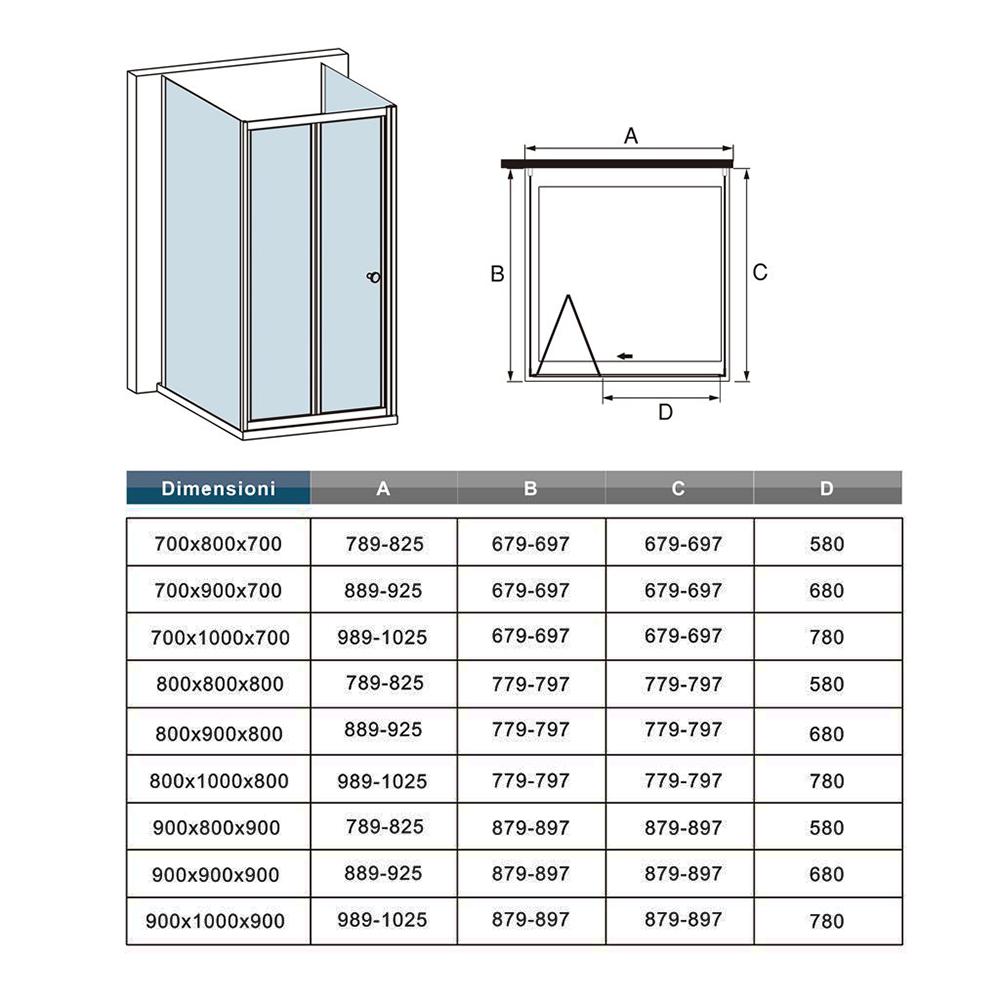 • Dimension:80 / 90 / 100 (porte) x 70 / 80 / 90 (2 x parois) x 185cm (Veuillez trouver l'extensibilités sur le schéma)