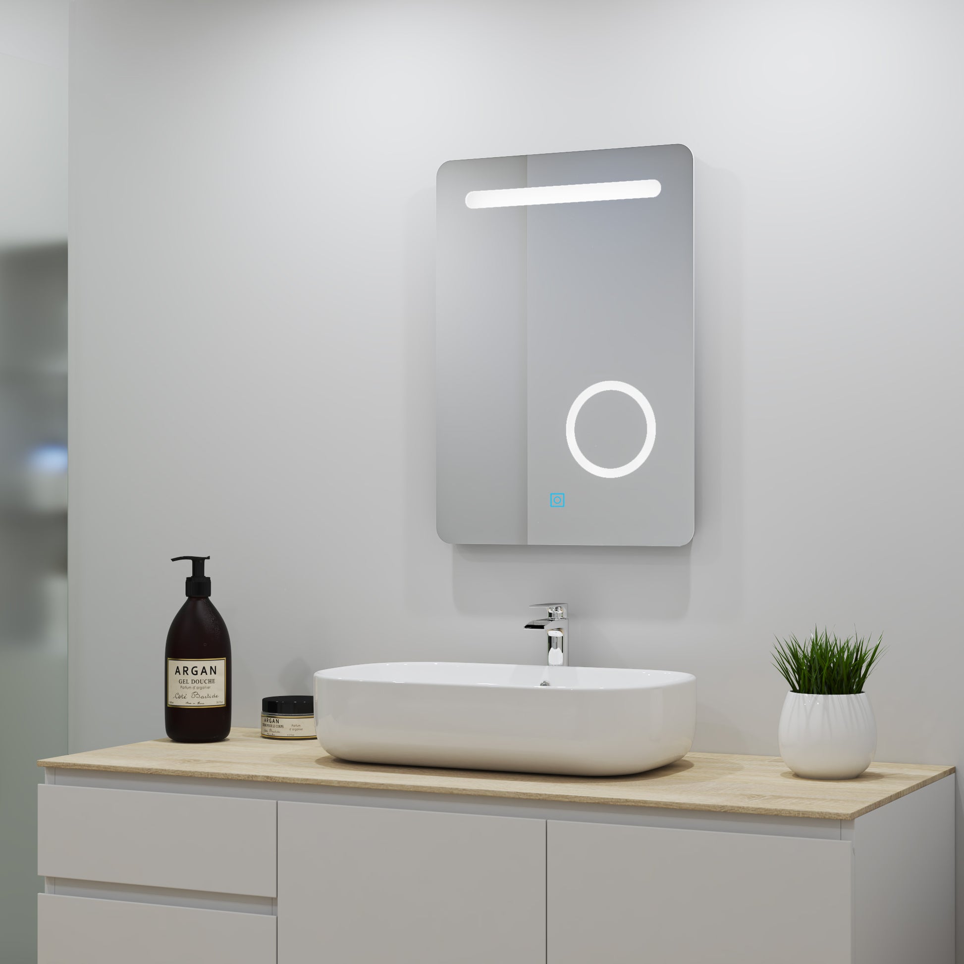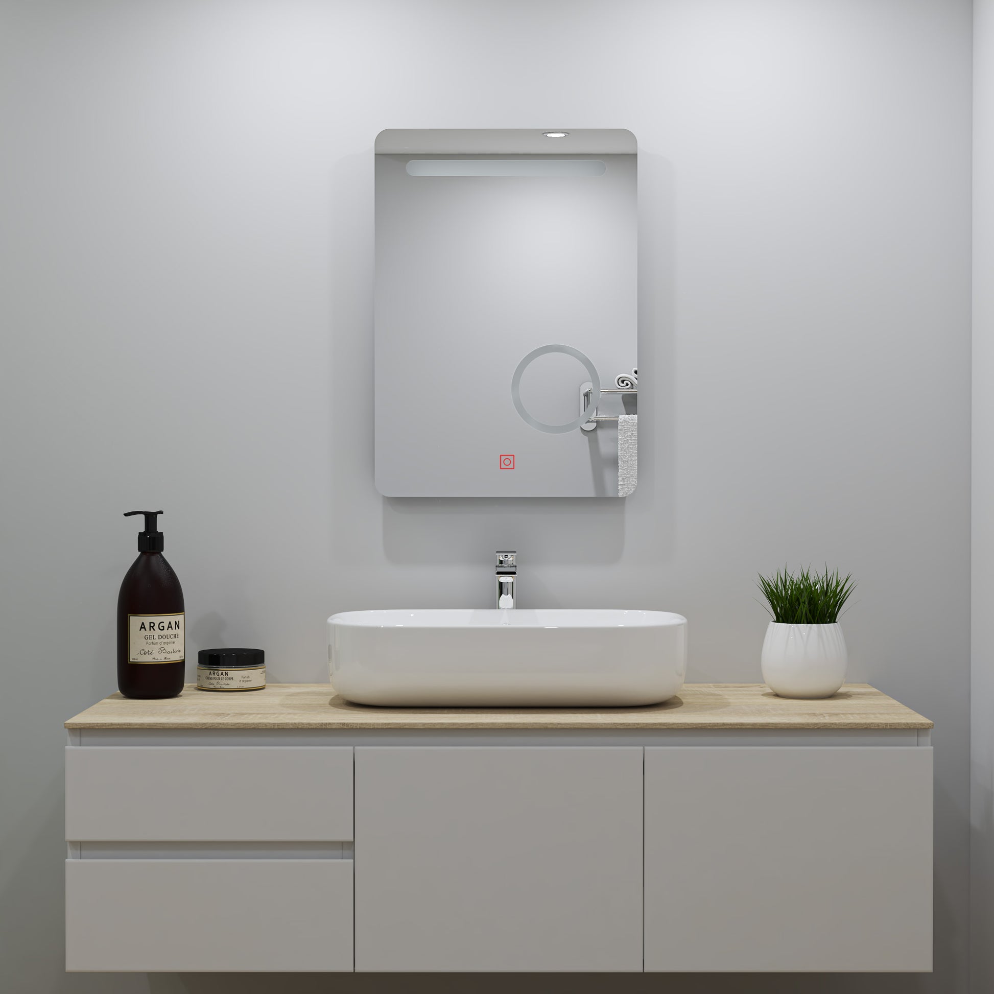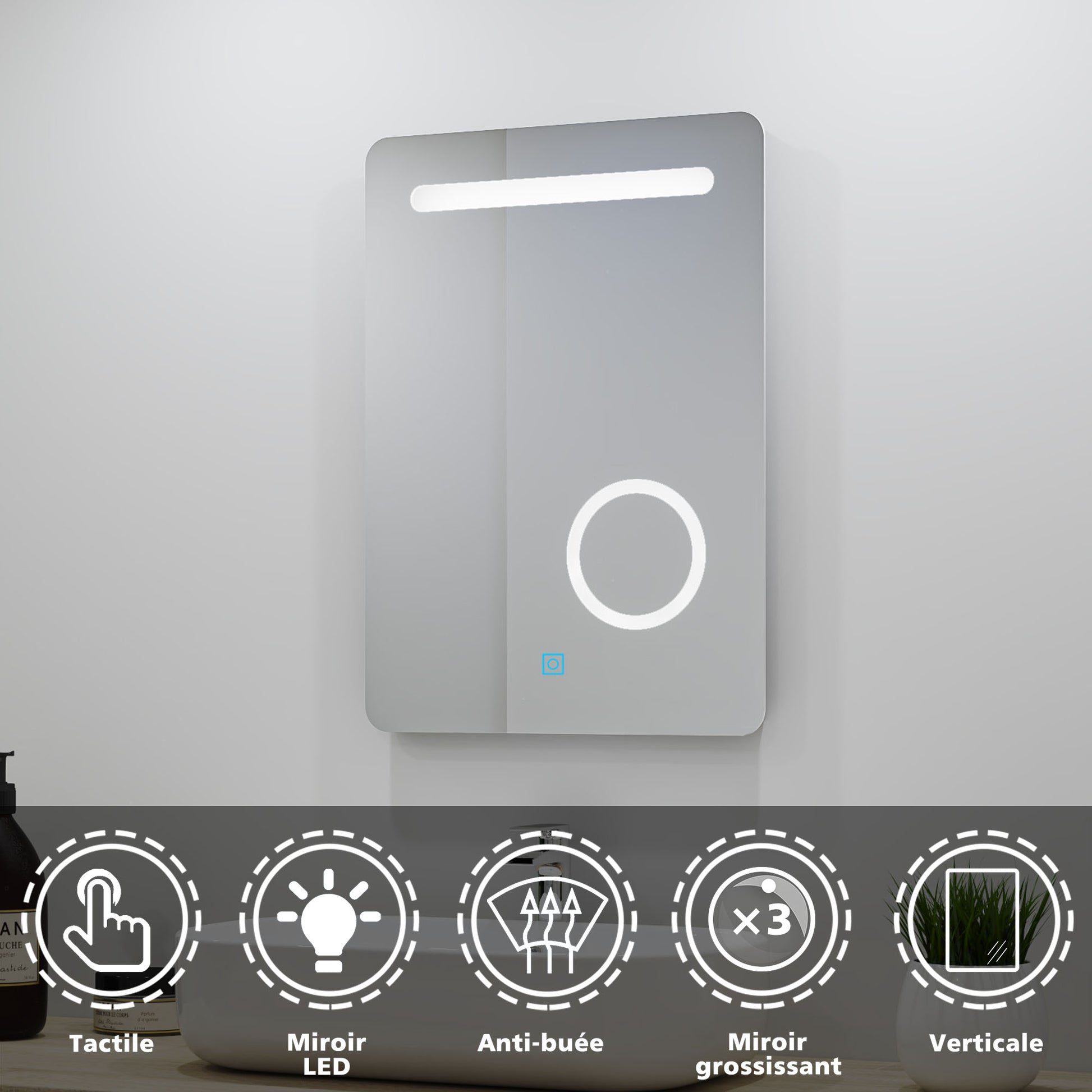 Interrupteur mural- Vous n’aurez plus à traverser toute votre salle de bain dans le noir pour allumer la lumière du miroir. Le miroir est à connecter avec un interrupteur mural, plus facile à trouver. Nos miroirs se servent de diodes SMD 2835 générant une lumière plus intense. ATENTION :Il n’y a pas d’interrupteur sur la surface du miroir