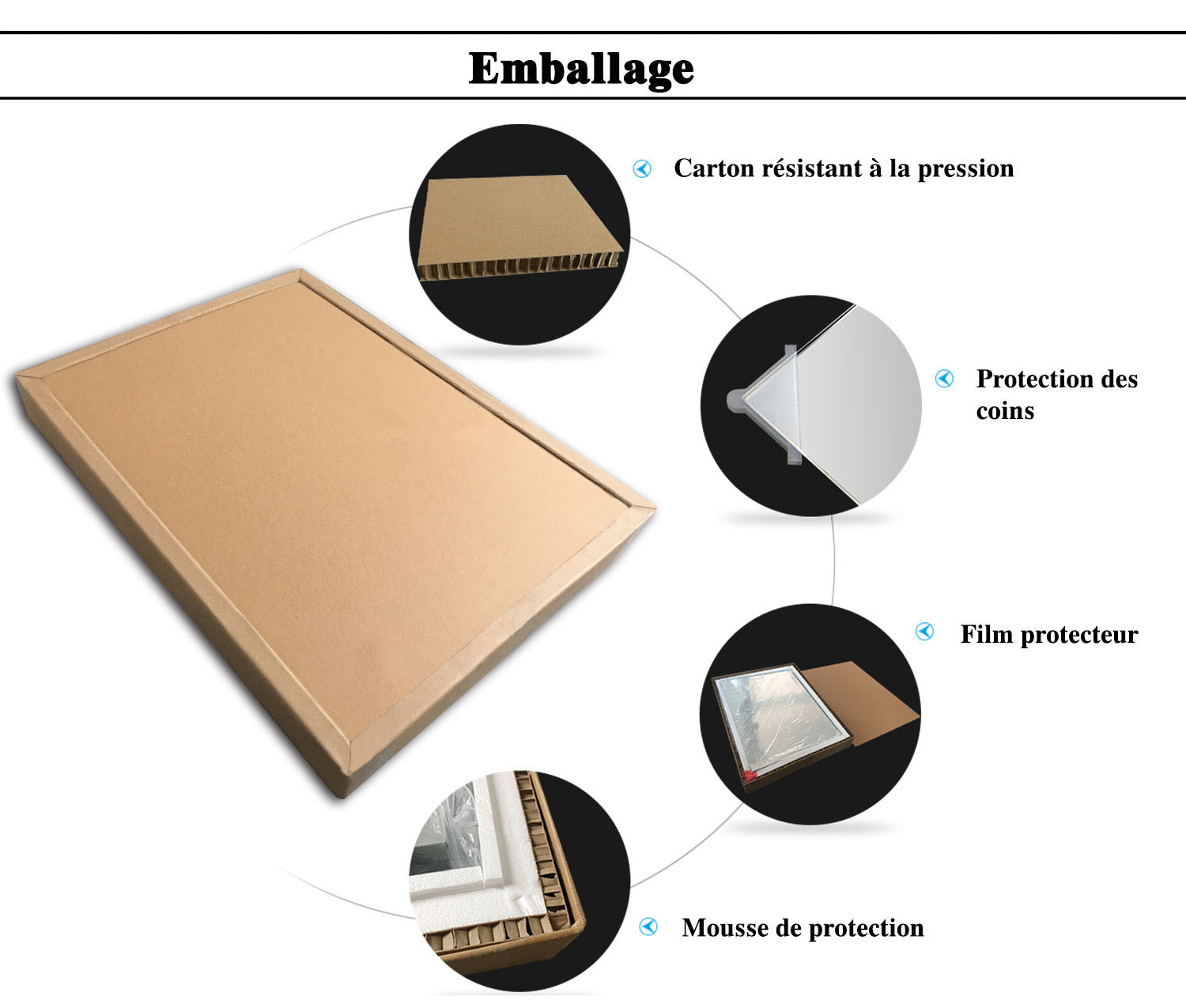 Expedition securise e- Chaque miroir est emballé en toute sécurité dans une boîte renforcée de haute qualité, et couvert par un film en plastique réduisant tout risque d’endommagement pendant le transport.