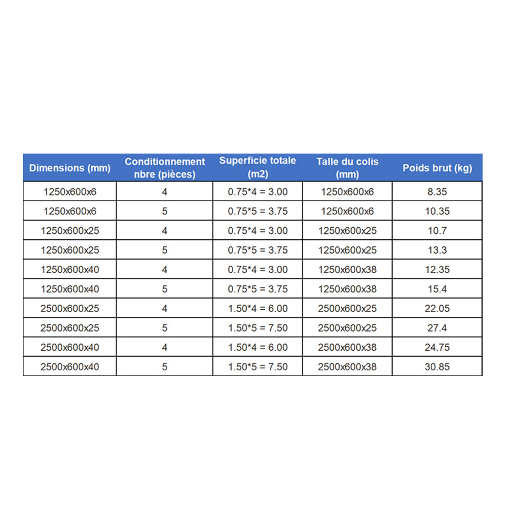 Plusieurs épaisseurs comprises entre 6 mm et 40mm.