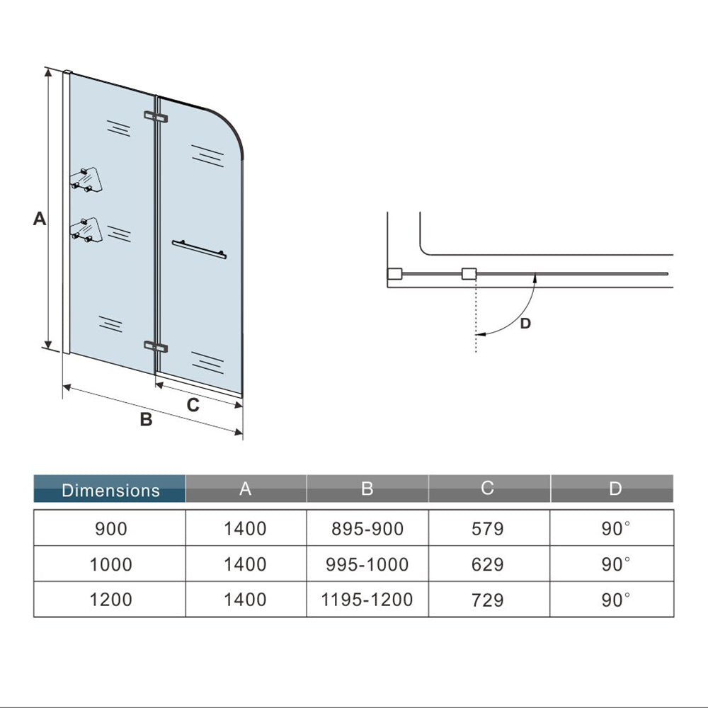 • Type: pare-baignoire pivotant,montage réversible gauche ou droite,Dimension:90/100/120x140cm hatueur:140cm,Réglable,veuillez trouver les dimensions extension sur le schéma.