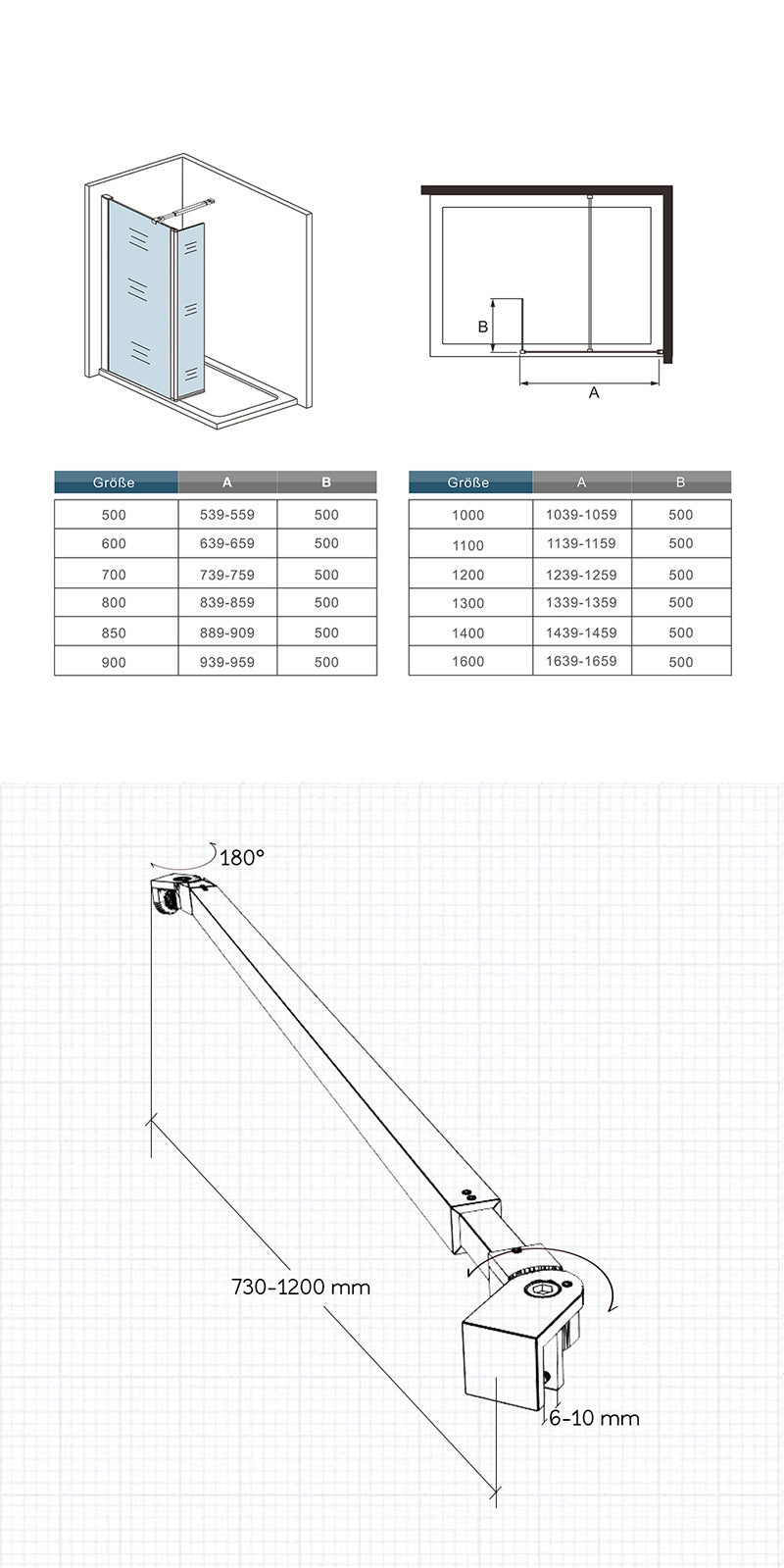 • Dimension: 500-1600x2000x8mm et un retour de 500x2000x6mm, verre empêche complètement l’apparition de taches de calcaire et conséquemment l’entretien des vitres serait très facile à faire.