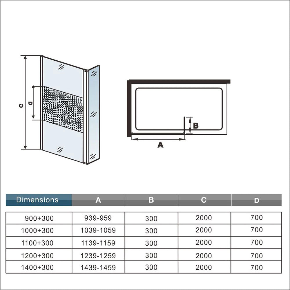 • Dimensions: 90 / 100 / 110 / 120 + 30 x 200cm,8mm de Verre anti-calcaire et verre bande central dépoli (traitements anticalcaires).