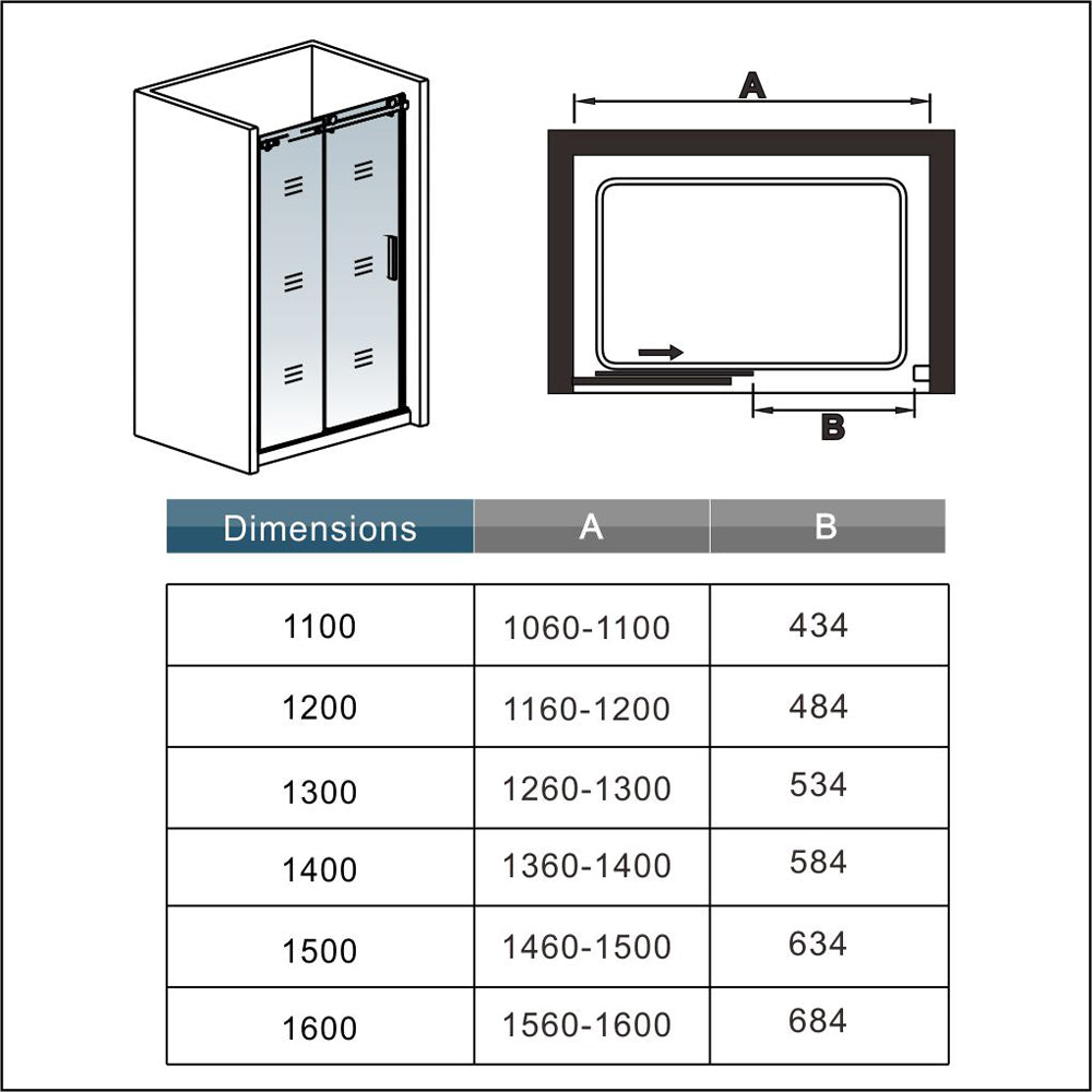 • Type: Porte de douche coulissante,installer en niche montage réversible gauche ou droite,Dimension:100/ 120 / 130 / 140 / 150 / 160 x 195cm hatueur:195cm,Réglable,veuillez trouver les dimensions extension sur le schéma.