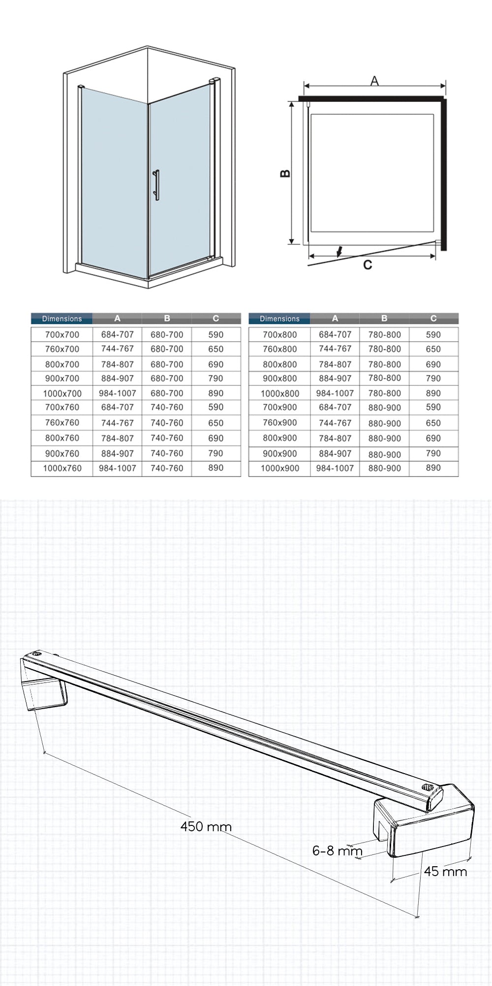 • porte: 70 / 76 / 80 / 90 / 100cm, paroi: 70 / 76 / 80 / 90 cm,livré avec une barre de fixation 45cm,mais pas de receveur de douche