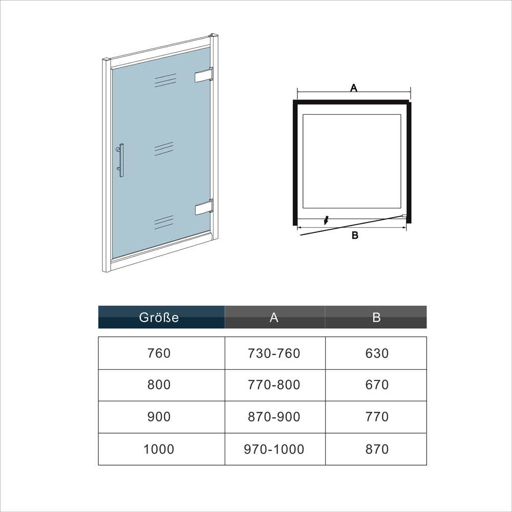 • Type: porte de douche pivotante, montage réversible gauche ou droite,Dimension: 80/90/100 x 185 cm veuillez trouver les dimensions extension sur le schéma.
