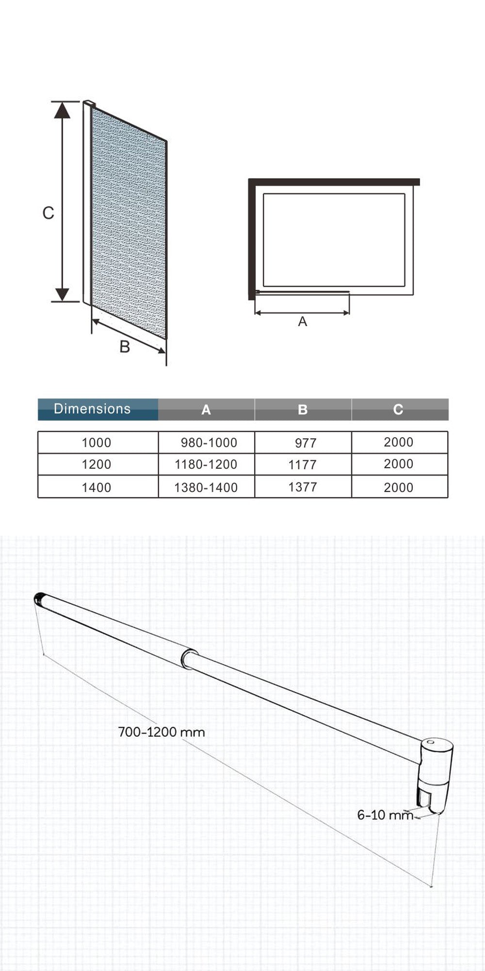 Paroi de douche à l'italienne en verre 8mm de sécurité sablé, Océan paroi de douche 100 - 140 x 200cm avec une barre de stabilisation ronde extensible