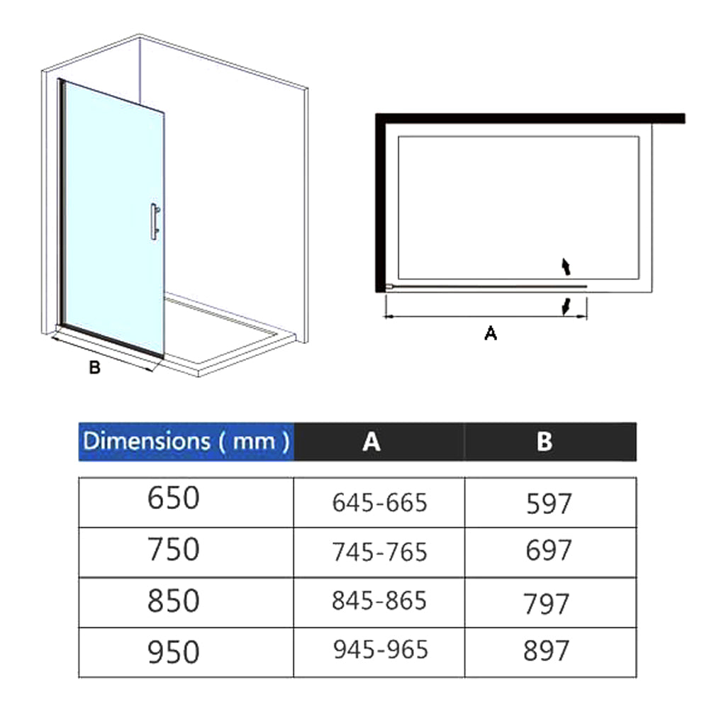 • Type: Porte de douche pivotante. Dimension: 65 / 75 / 85 / 95 x 180cm hatueur:180cm, Réglable, veuillez trouver les dimensions extension sur le schéma.